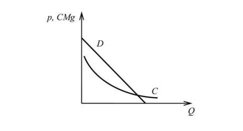 Com relação a um produto de um mercado que está sob a situação de monopólio natural, o gráfico a seguir mostra: a curva de demanda, D, que corresponde ao preço de venda, p, para cada quantidade, Q, demandada pelo mercado, e a curva de custo marginal, C, que corresponde ao custo marginal, CMg, quando a produção atinge Q unidades.