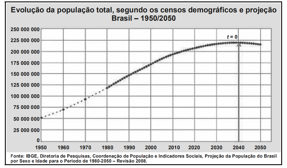 O gráfico a seguir apresenta a evolução da população brasileira de acordo com os censos demográficos, além de uma projeção dessa evolução até o ano de 2050.